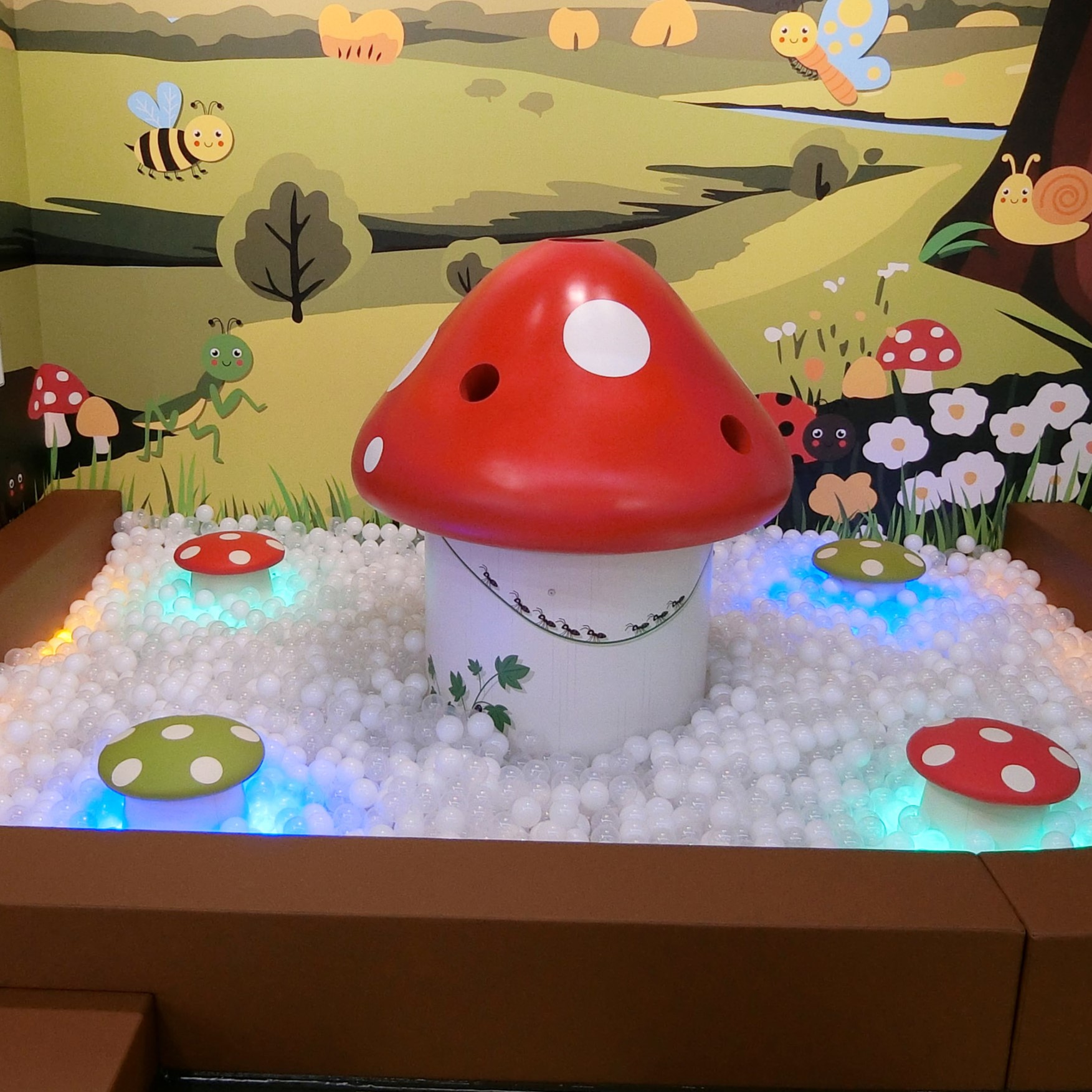 きらきら光るキノコにボールを入れるとふわっと浮かぶよ。ボールプールで遊んじゃおう!