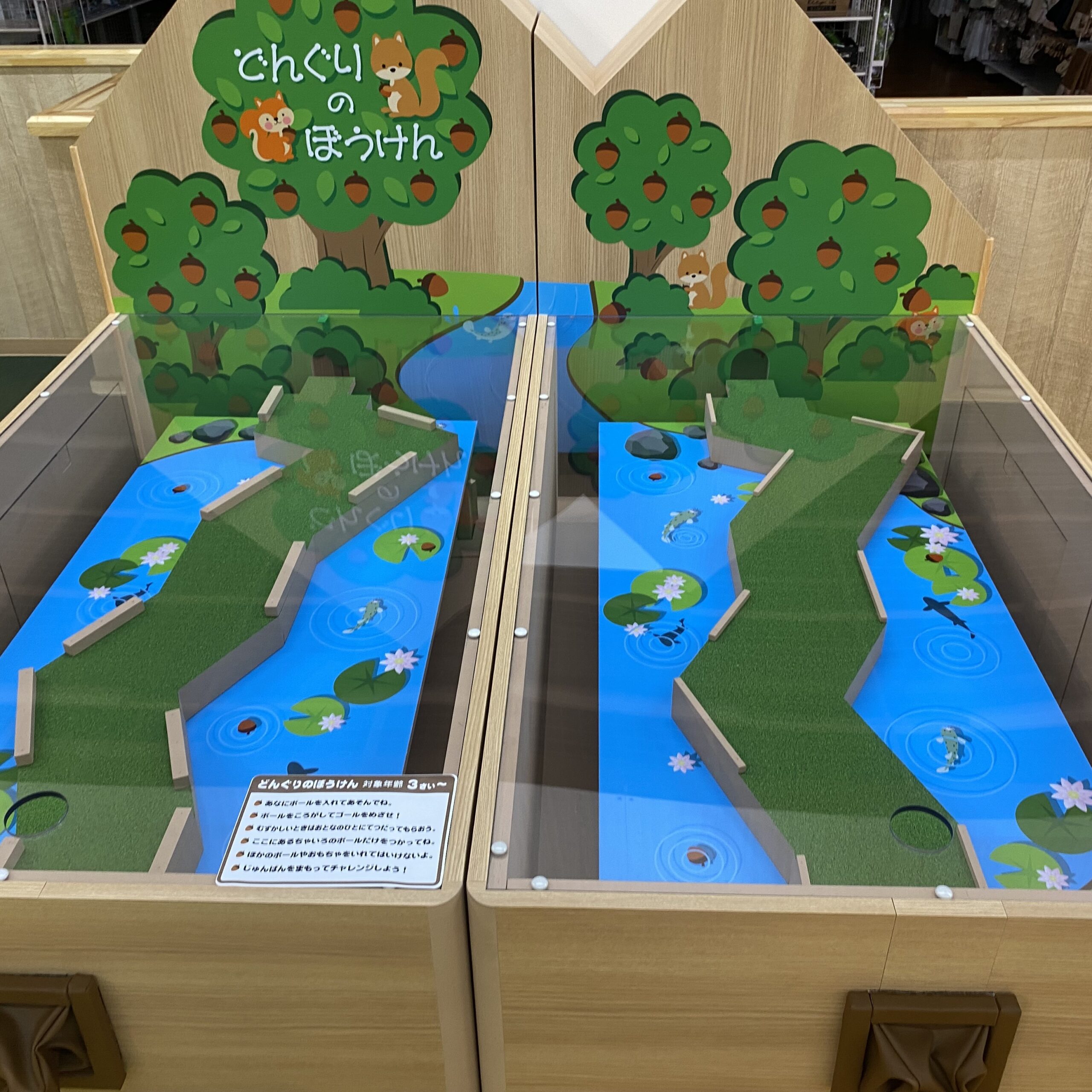 穴にボールを入れてゴールを目指そう!ゴールまで行くとどんぐりたちが歌いだすよ。