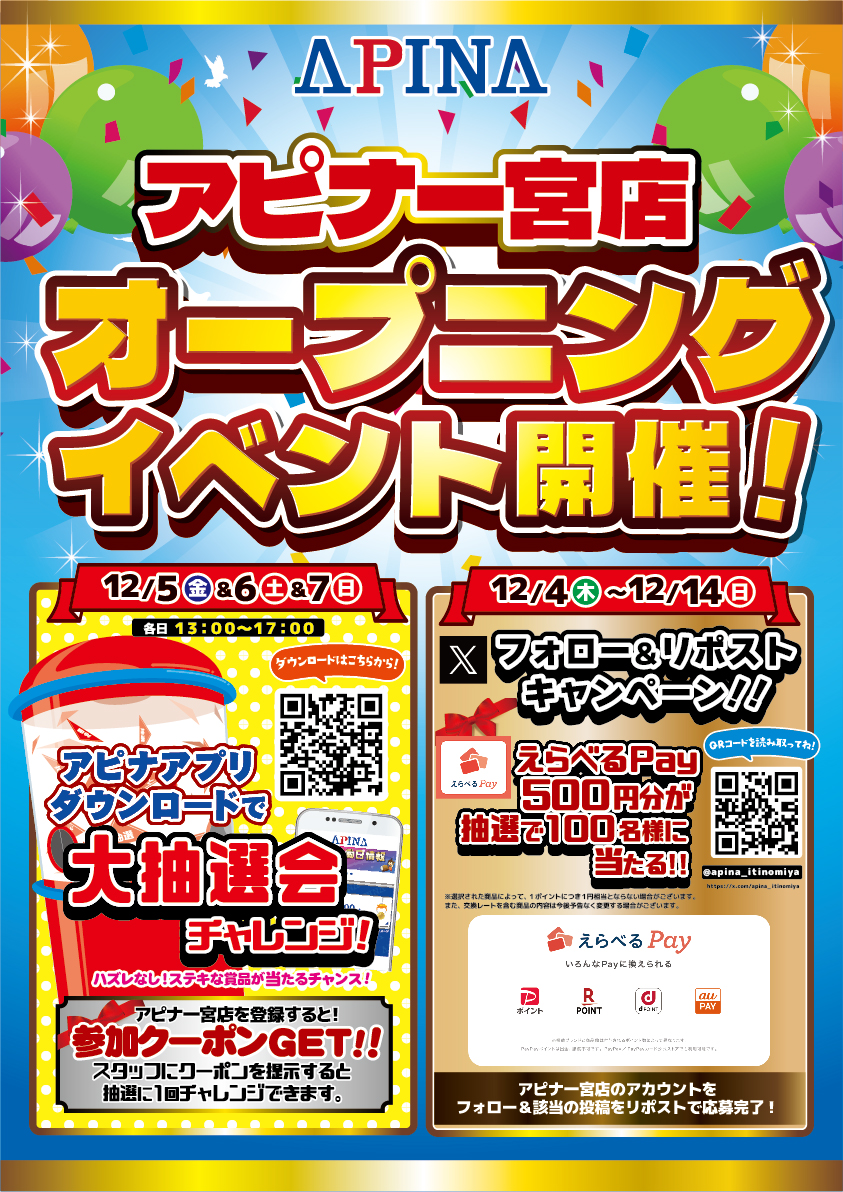 アピナ一宮店のXアカウントをフォロー&該当のポストをリポストすると抽選で100名様に500円分の「えらべるPay」をプレゼント!